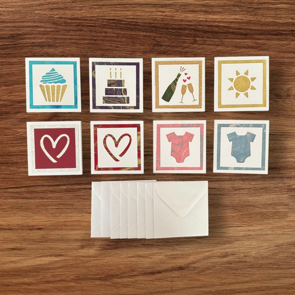 Perfect for gift tags or quick personal notes, our handmade mini cards feature our most popular intricate die-cut designs adorned with handmade accent paper. Each 3″ x 3″ card is hand crafted on 100# weight paper and comes with a fitted blank envelope.
